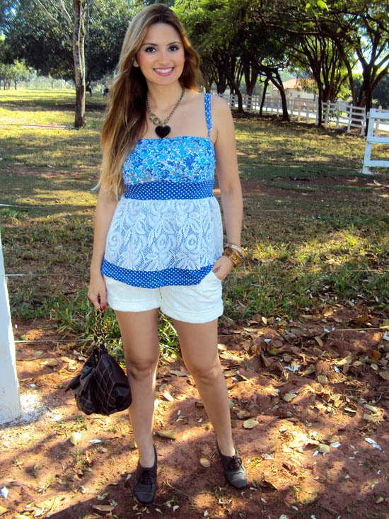 Blusa prateada com detalhes de cristais. O efeito final fica por conta dos detalhes dourados da blusa (quem disse que prata + dourado não "conversam"? Acho essa blusa um arraso) que fizeram um belo contraste com o elástico trabalhado da saia. Os acessórios dourados trazem mais riqueza para a produção final.